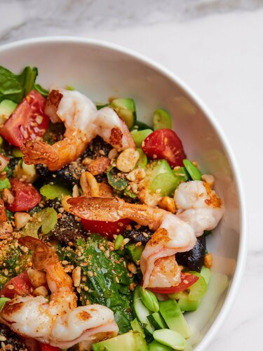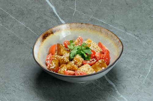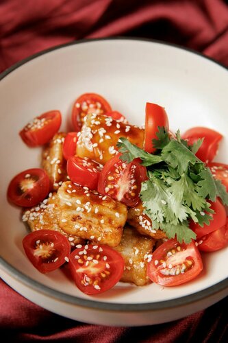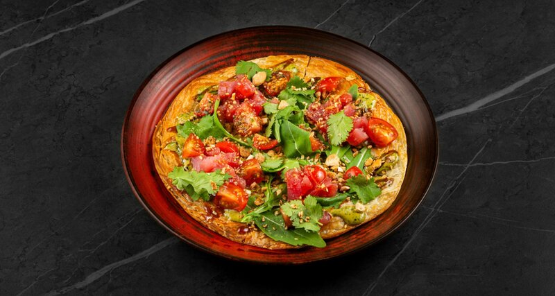 Томаты черри, кешью, соус унаги, пряный соус с кинзой, тунец